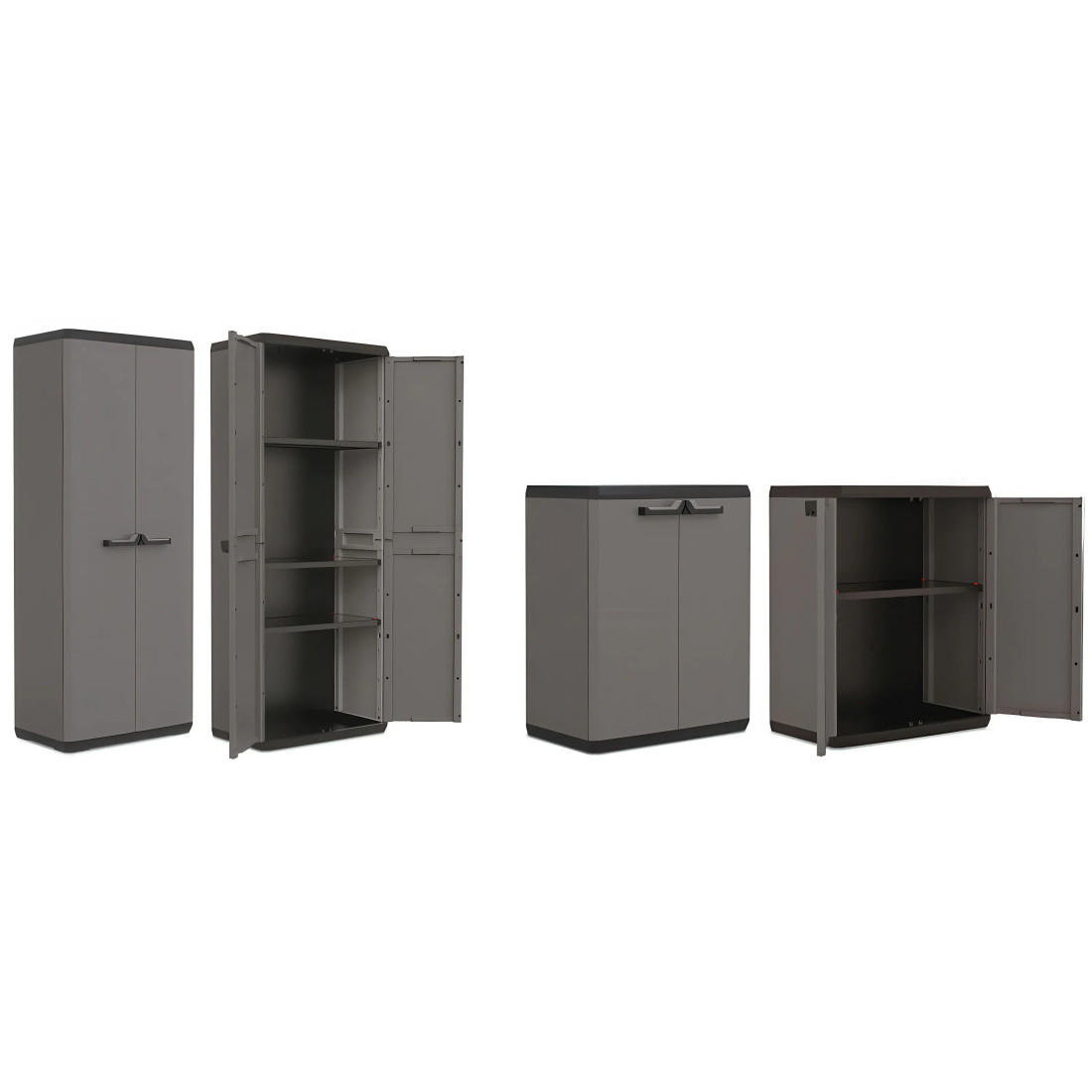 Szafy gospodarcze KETER/KIS PIU SET to precyzyjnie zaprojektowane rozwiązania dla każdego rodzaju przestrzeni roboczej. Wykonane z odpornego na wpływy atmosferyczne polipropylenu, zapewniają trwałość i wytrzymałość. Kompaktowy projekt obejmuje modele PIU HIGH CABINET z trzema regulowanymi półkami oraz PIU LOW CABINET z jedną półką, pozwalające na efektywne zarządzanie przestrzenią.
