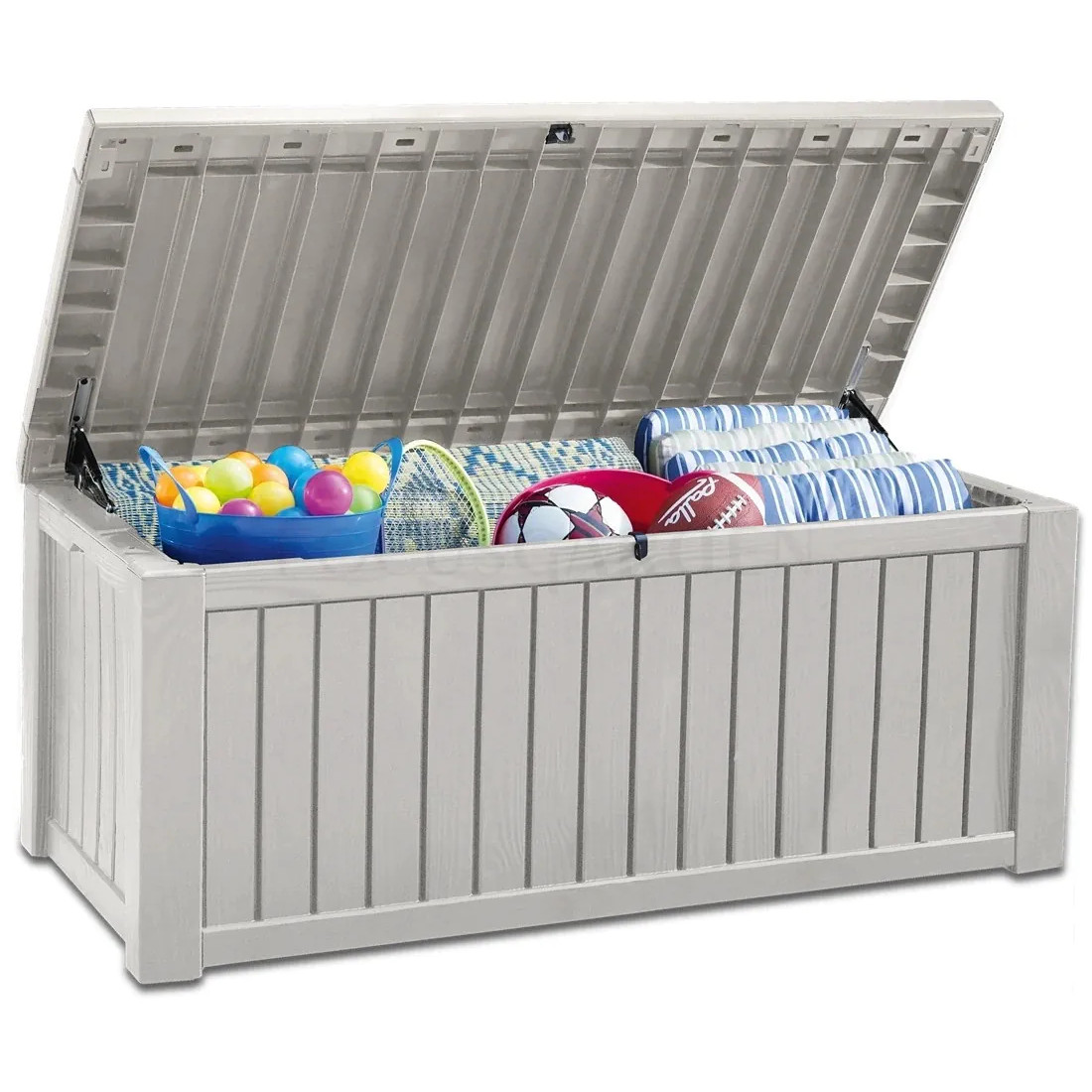 Skrzynia Keter ROCKWOOD BOX 570L Creme to rozwiązanie do przechowywania wykonane z trwałego tworzywa sztucznego, odpornego na warunki atmosferyczne i promieniowanie UV. Jej pojemność wynosi 570 litrów, co pozwala na wygodne składowanie różnorodnych akcesoriów ogrodowych. Wyposażona w automatyczny system otwierania, ułatwia dostęp do przechowywanych przedmiotów, a dodatkowa opcja zabezpieczenia na kłódkę zapewnia bezpieczeństwo. Unikalny design imituje naturalne drewno, co umożliwia estetyczne dopasowanie do każdej przestrzeni zewnętrznej.