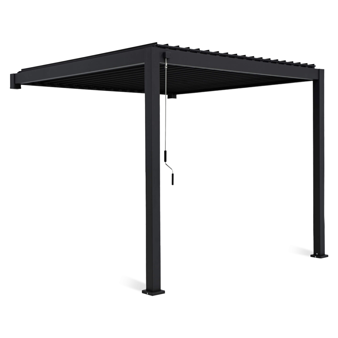 Pergola 3x3 Premium Wall Anthracite, wykonana z aluminium i stali, oferuje trwałe rozwiązanie zadaszenia tarasowego, odporne na zmienne warunki atmosferyczne. Wyposażona w regulowane lamele dachowe, z łatwym dostępem dzięki manualnej korbce, pozwala na kontrolowanie poziomu światła i ochrony przed opadami. System odprowadzania wody skutecznie zarządza deszczówką, a opcja montażu przyściennego ułatwia integrację z istniejącymi konstrukcjami.