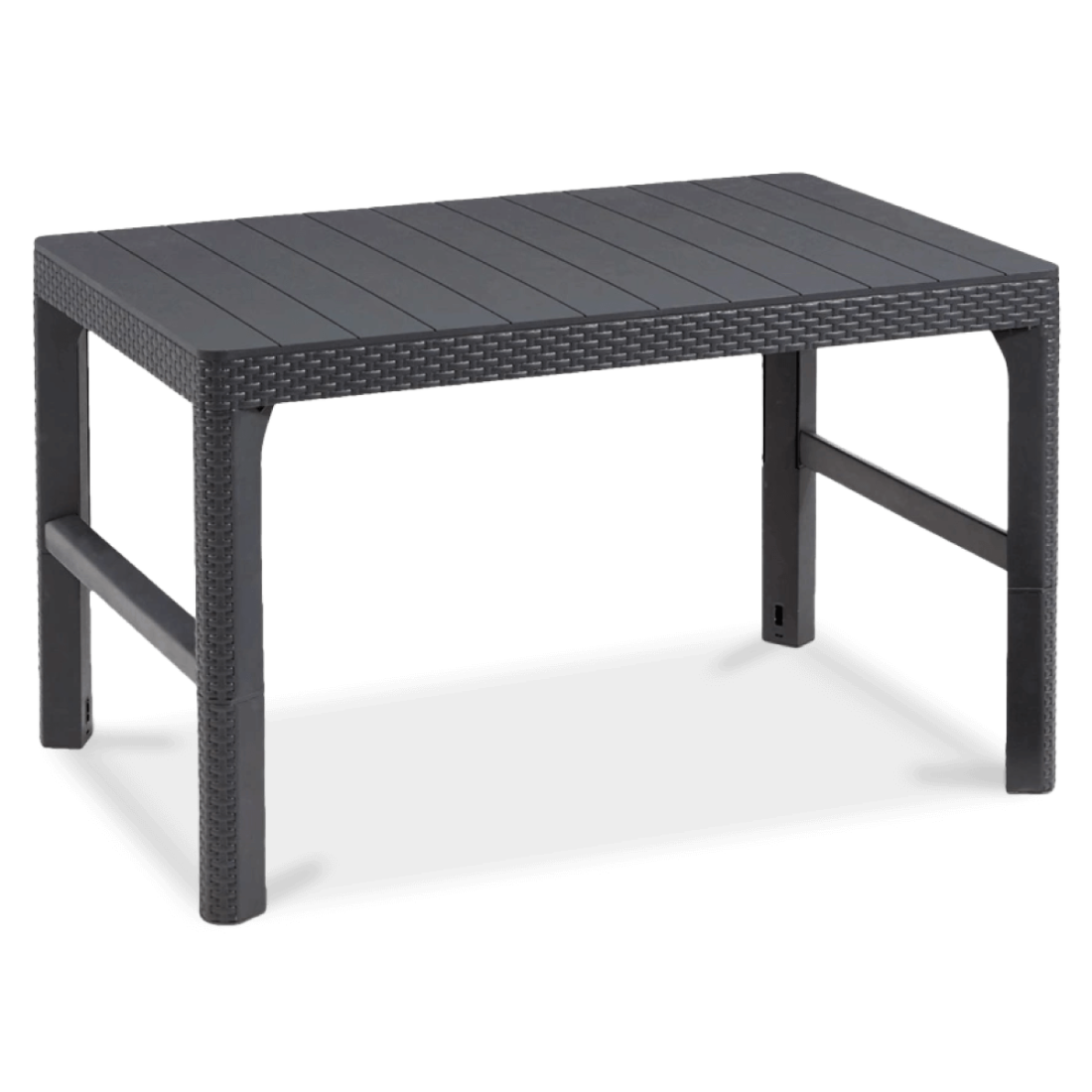 Dwupozycyjny stół ogrodowy Lyon umożliwia ustawienie w dwóch wysokościach: niskiej (kawa) i wysokiej (posiłki), co ułatwia dostosowanie przestrzeni do różnych potrzeb. Wykonany z wysokiej jakości polipropylenu w kolorze grafitowym, zapewnia odporność na warunki atmosferyczne i promienie UV, gwarantując trwałość przez cały rok.