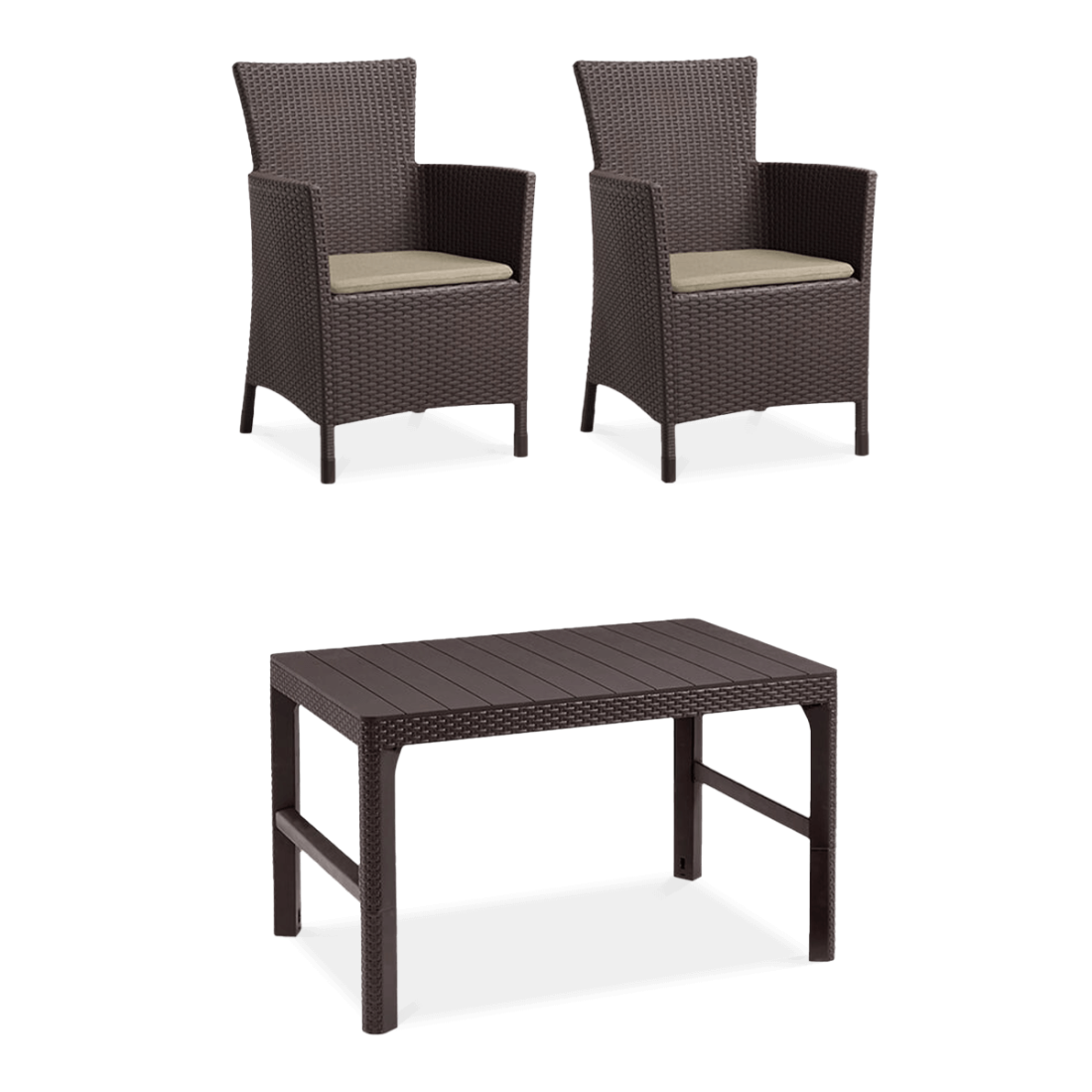 Zestaw balkonowy składający się z dwóch ergonomicznych foteli IOWA oraz funkcjonalnego stołu LYON został wykonany z wytrzymałego polipropylenu z imitacją rattanu. Fotele z wysokimi oparciami i poduszkami gwarantują komfort siedzenia, natomiast stół oferuje dwa warianty wysokości użytkowej.
