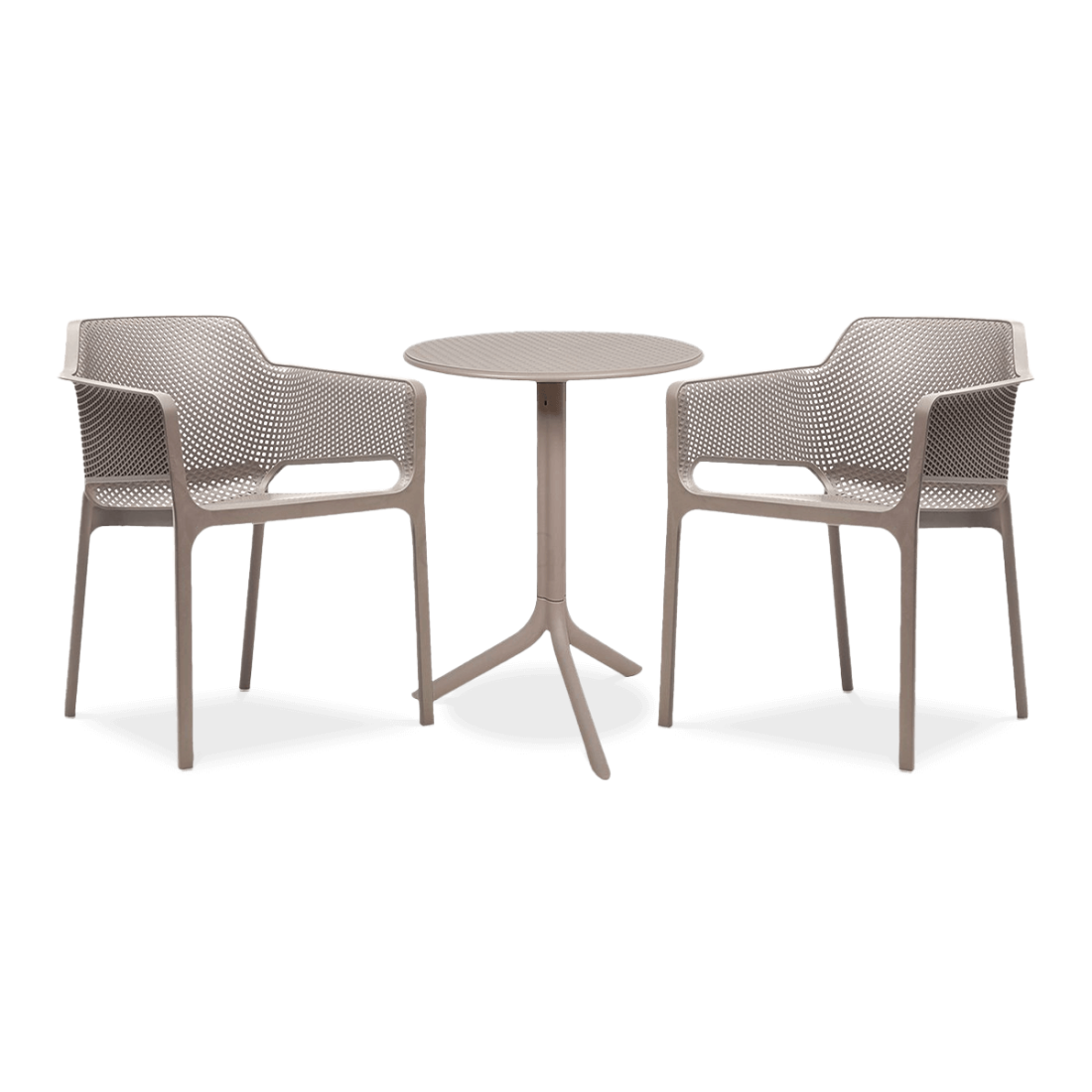 Zestaw Nardi NET/STEP 2+1 Tortora składa się z dwóch ergonomicznych krzeseł oraz innowacyjnego stolika, którego wysokość można dostosować w zależności od potrzeb. Kompozyt polipropylenu z włóknem szklanym gwarantuje wysoką trwałość i odporność na działanie warunków atmosferycznych oraz promieniowanie UV, co minimalizuje potrzebę konserwacji.