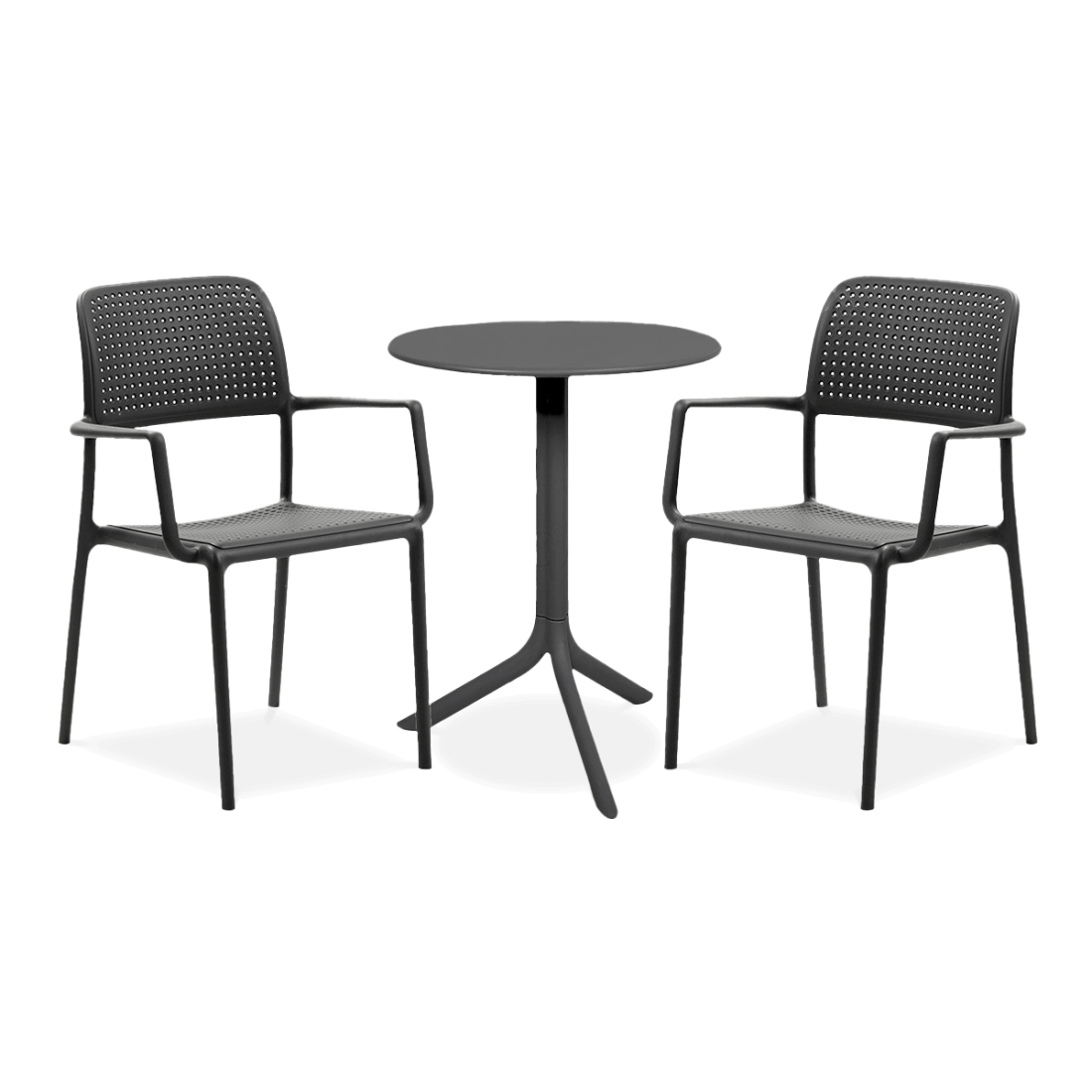 Włoski zestaw mebli ogrodowych BORA/SPRITZ 2+1 w kolorze antracytowym to doskonała propozycja dla przestrzeni komercyjnych. Wykonane z wysokiej jakości polipropylenu z dodatkiem włókna szklanego, zapewniają trwałość i odporność na zmienne warunki atmosferyczne.