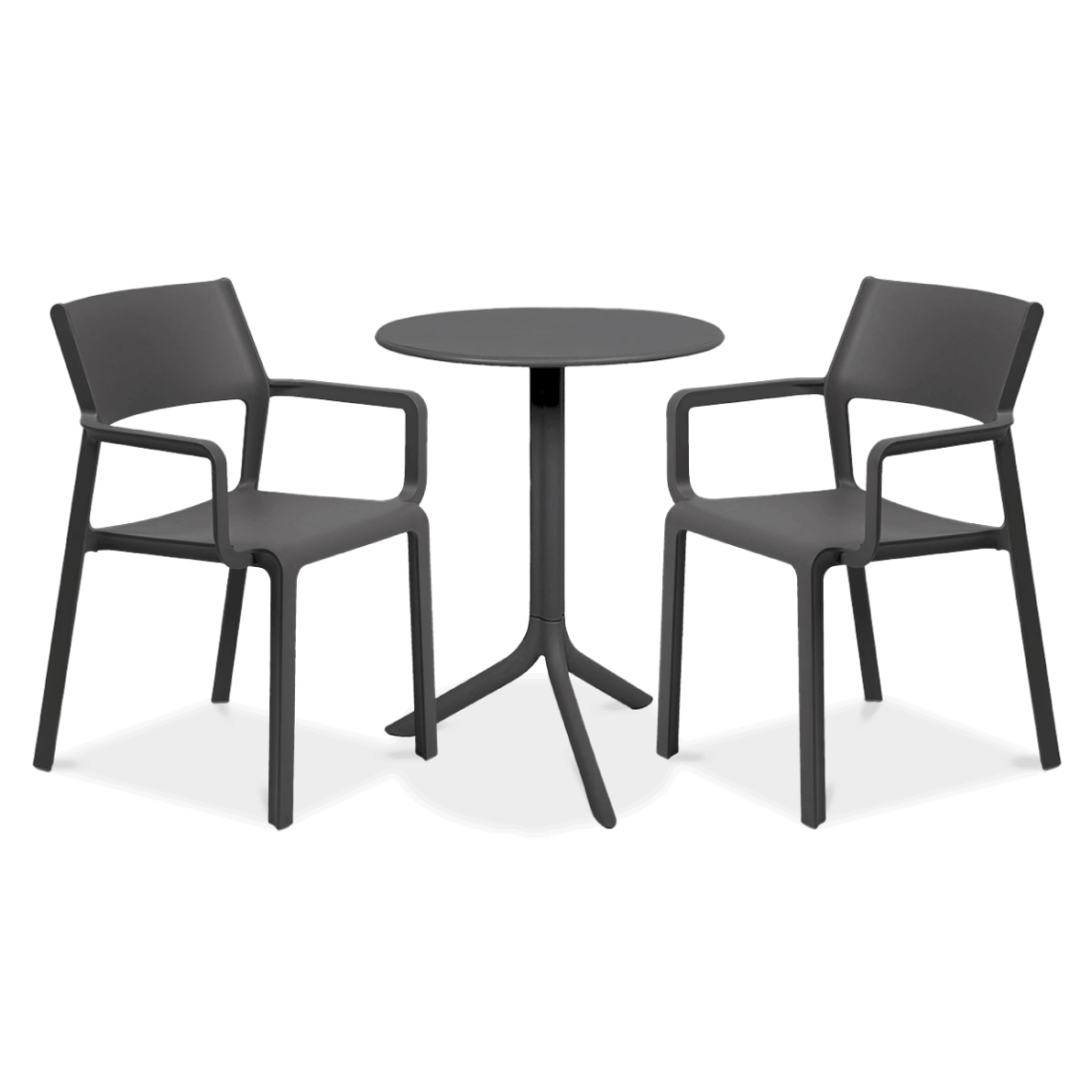 Zestaw ogrodowy Nardi TRILL/SPRITZ 2+1 w kolorze Antracite to rozwiązanie stworzone z myślą o wymaganiach rynku komercyjnego. Włoski design i trwałe materiały, takie jak polipropylen wzbogacony włóknem szklanym, gwarantują nie tylko estetykę, ale również wyjątkową wytrzymałość. Komplet zawiera dwa komfortowe krzesła i stolik z możliwością ustawienia na dwóch wysokościach.