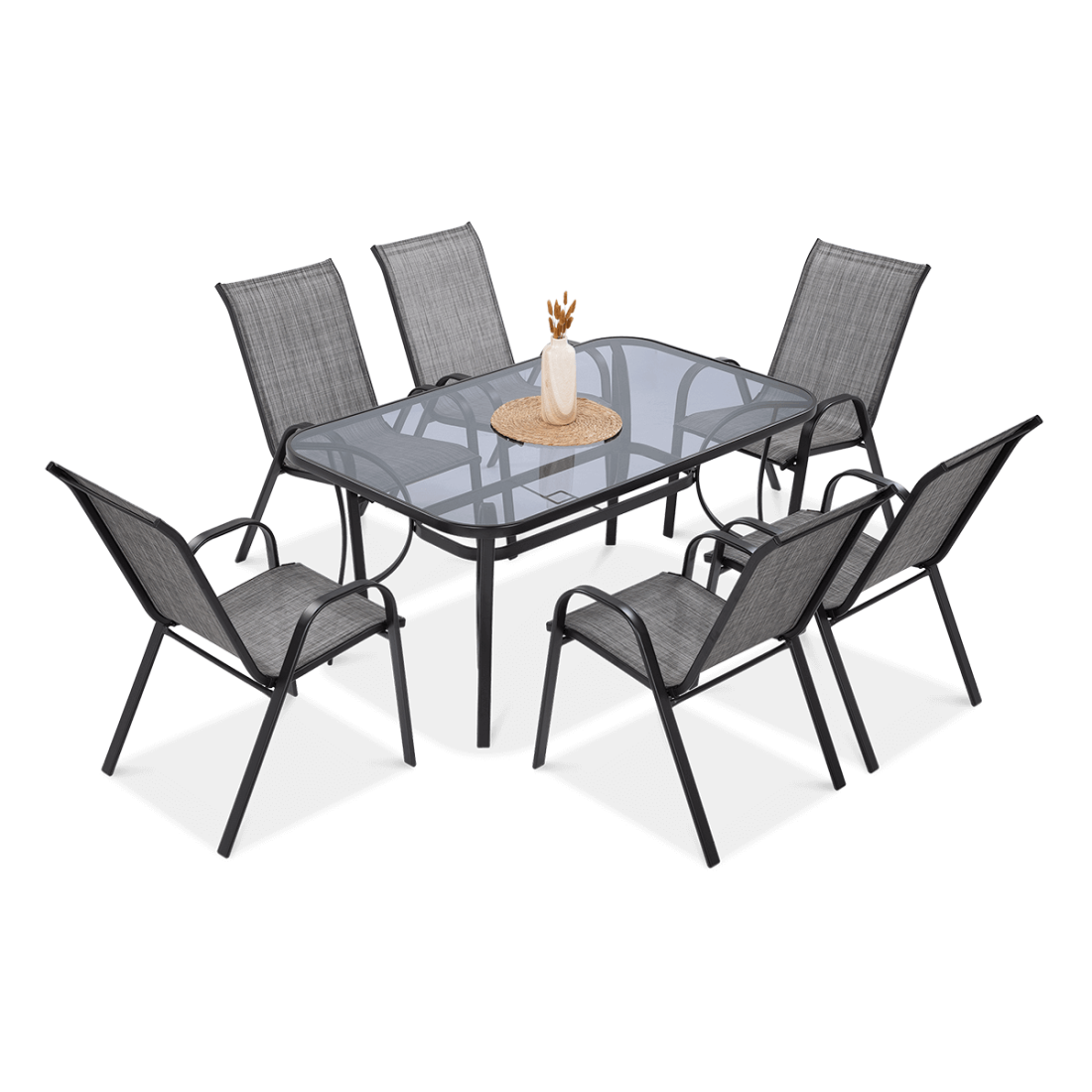 Zestaw ogrodowy BOLOGNA 150/6 Mixed Grey składa się z sześciu krzeseł oraz stołu o solidnej konstrukcji. Elementy metalowe wykonane są ze stali pokrytej powłoką proszkową, co zwiększa ich odporność na warunki atmosferyczne. Krzesła wyposażono w wytrzymałą tkaninę Textilene, która eliminuje potrzebę użycia poduszek, podczas gdy stół posiada powierzchnię z hartowanego szkła z miejscem na parasol.