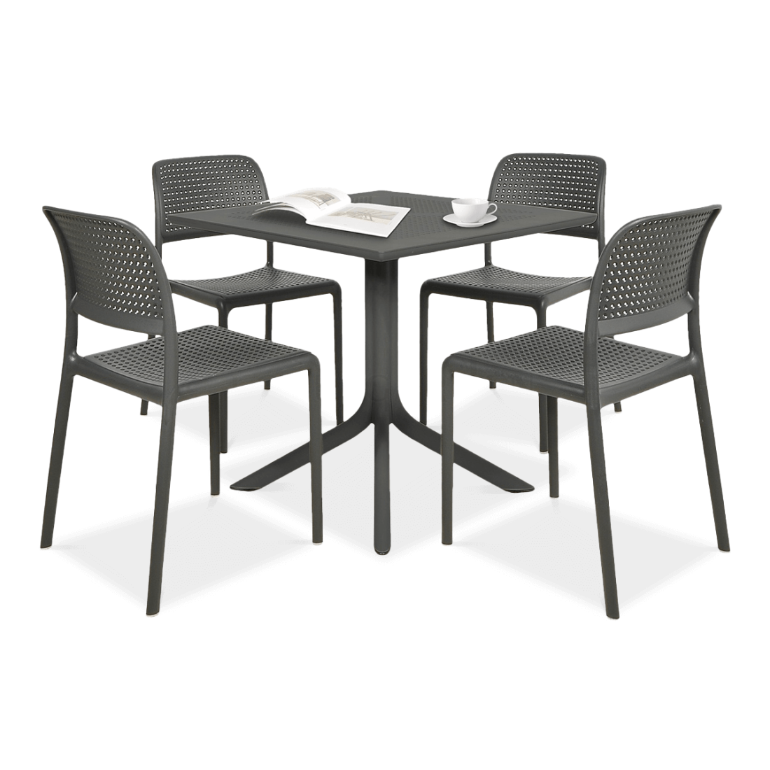 Meble Nardi z serii BORA BISTROT/CLIP to zestaw jadalniany wykonany z wysokiej jakości polipropylenu wzmacnianego włóknem szklanym. Składa się z czterech krzeseł i jednego stołu, tworząc funkcjonalne rozwiązanie dla przestrzeni publicznych. Antypoślizgowe nóżki i możliwość sztaplowania krzeseł zapewniają efektywne zarządzanie przestrzenią.