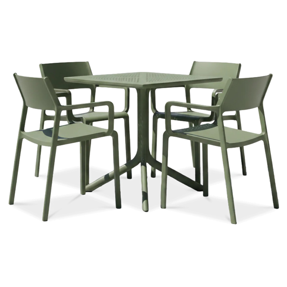 Zestaw mebli ogrodowych TRILL/CLIP 70 4+1 AGAVE to komplet składający się z jednego stołu CLIP 70 oraz czterech krzeseł TRILL. Produkty wykonane są z trwałego polipropylenu wzmocnionego włóknem szklanym, co zapewnia wytrzymałość oraz odporność na działanie promieni UV i zmienne warunki atmosferyczne. Stół posiada regulowane nóżki umożliwiające poziomowanie na nierównych powierzchniach, a jego azurowy blat wykonany jest z kompozytu DurelTOP. Krzesła można sztaplować, co ułatwia ich przechowywanie.