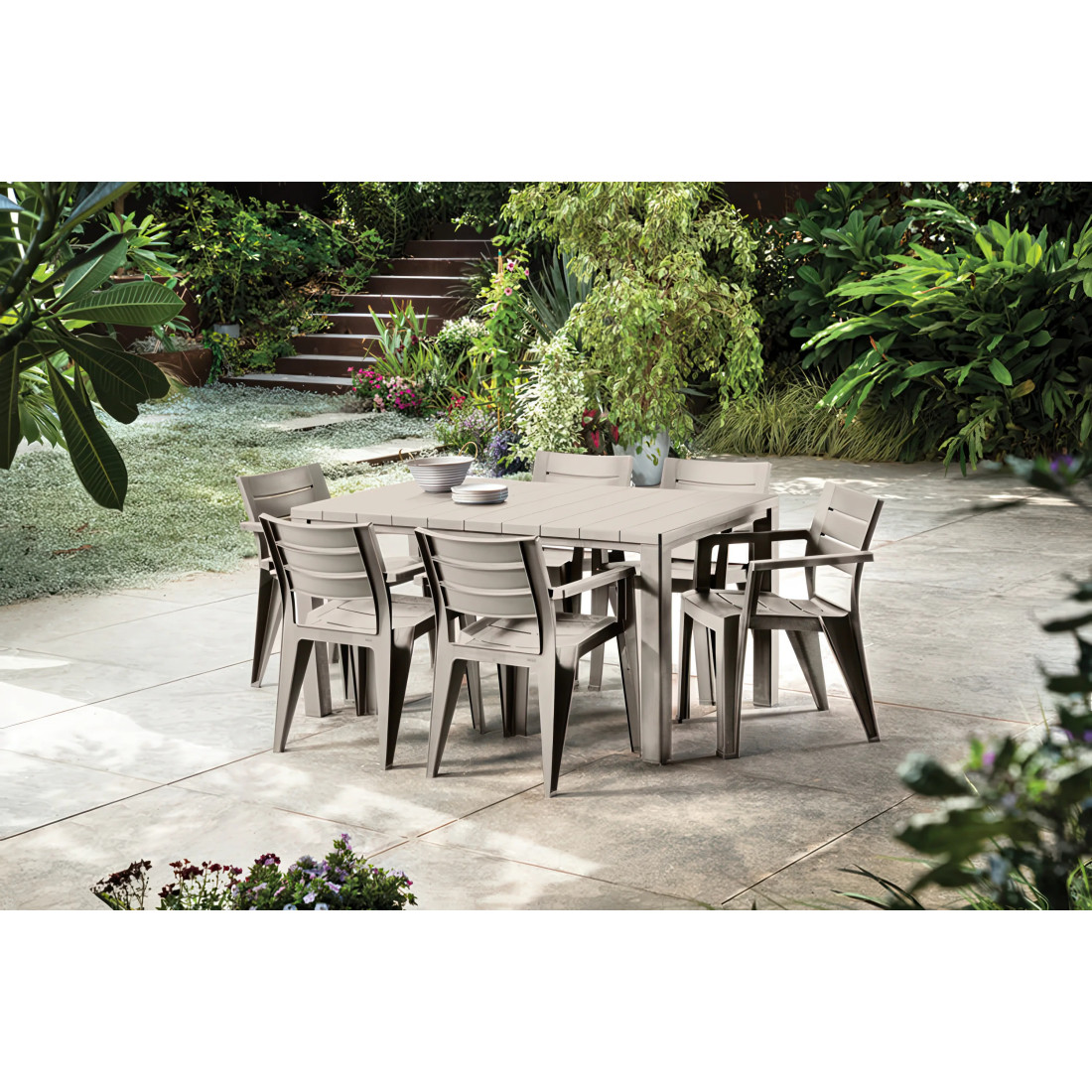 Zestaw ogrodowy JULIE 6+1 to propozycja dla firm szukających solidnego rozwiązania dla przestrzeni wypoczynkowych. Komplet obejmuje sześć krzeseł z ergonomicznymi siedziskami oraz stół o długości 147 cm, charakteryzujący się otworem na parasol. Wykonany z trwałego polipropylenu, zapewnia odporność na zmienne warunki atmosferyczne oraz promieniowanie UV.