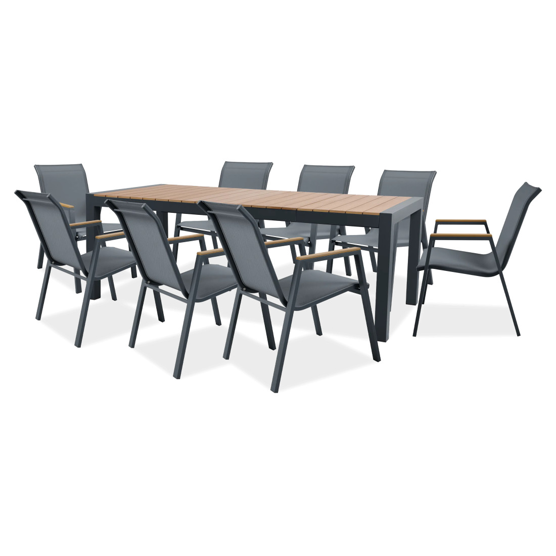 Zestaw jadalniany MALAWI 8+1 Dark Grey firmy Bjørkka łączy nowoczesne technologie z solidną konstrukcją. Stoły wyposażone w rozkładany blat z Heat Transfer Polywood, który imituje drewno i zapewnia trwałość w trudnych warunkach atmosferycznych. Konstrukcja z aluminium pomaga w ochronie przed korozją. Komplet zawiera osiem ergonomicznych krzeseł ze sztaplowaniem, co ułatwia ich przechowywanie.