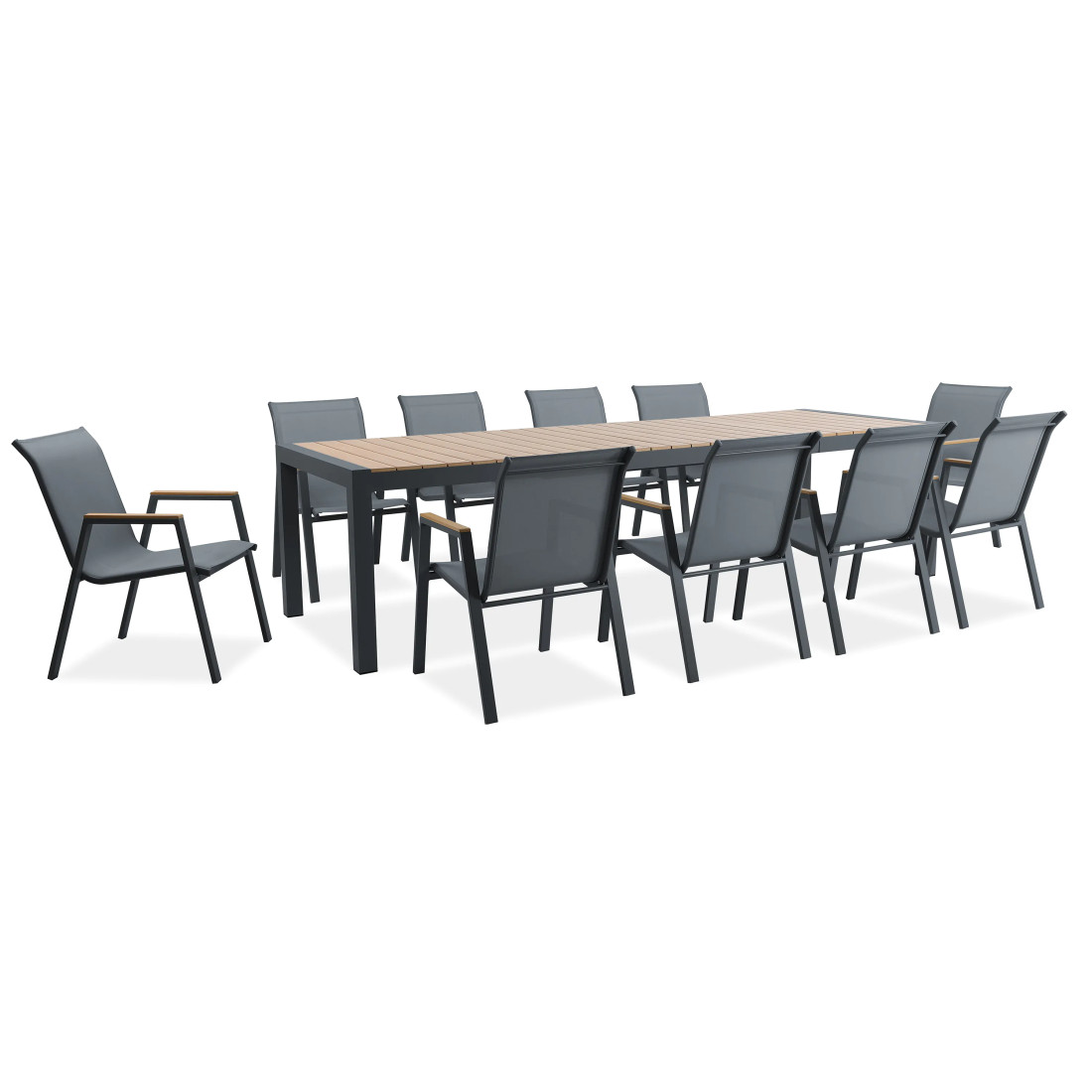 Zestaw jadalniany MALAWI 10+1 Dark Grey marki Bjørkka składa się z rozkładanego stołu i dziesięciu krzeseł, idealnych do wykorzystania w przestrzeniach zewnętrznych. Stół z blatem Heat Transfer Polywood, o grubości 14 mm, jest odporny na warunki atmosferyczne i ścieranie, co czyni go wyjątkowo trwałym. Aluminiowa konstrukcja zapewnia stabilność i odporność na korozję. Krzesła wykonane z przewiewnej tkaniny Textiline zapewniają komfort użytkowania przez długie godziny.