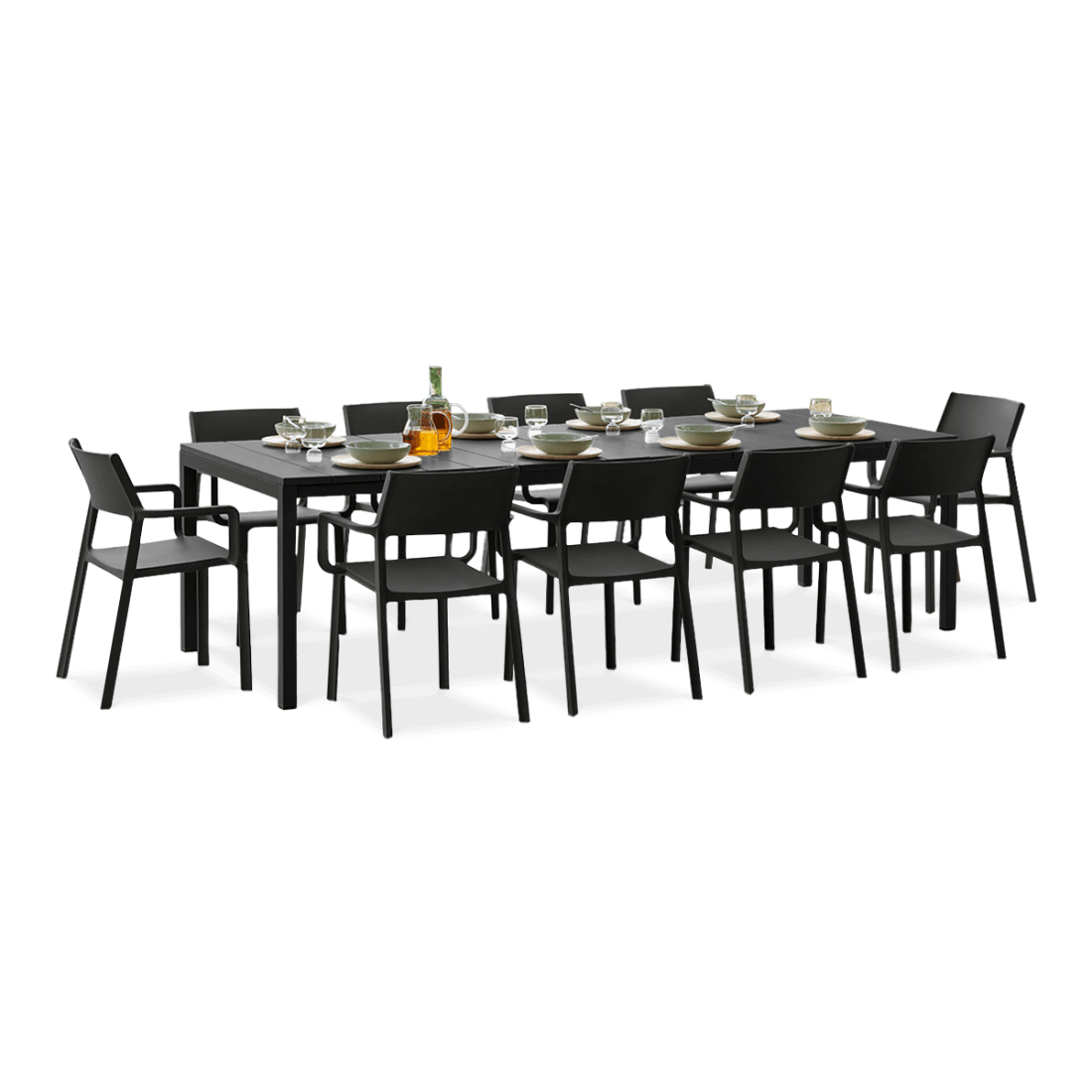 Zestaw ogrodowy Nardi TRILL/RIO 10/210 Antracite składa się z dziesięciu ergonomicznych krzeseł oraz rozkładanego stołu. Wykonany jest z wysokogatunkowego polipropylenu, a jego solidna konstrukcja z aluminium malowanego proszkowo zapewnia trwałość oraz odporność na czynniki atmosferyczne. Blat stołu można regulować w zakresie od 210 do 280 cm, co umożliwia dopasowanie do liczby gości. Dodatkowym atutem jest możliwość piętrowania krzeseł, co ułatwia przechowywanie.