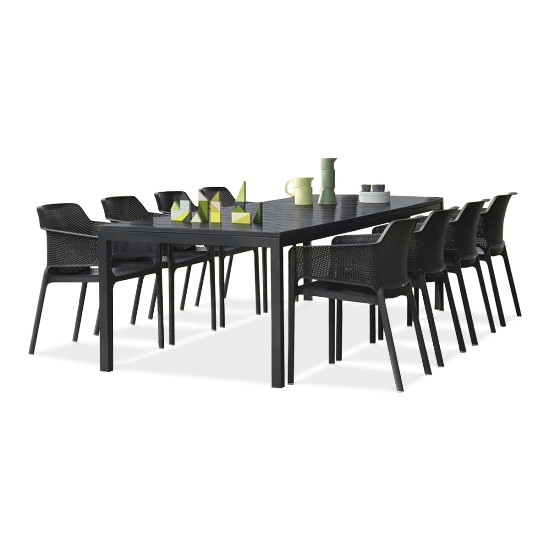 Zestaw ogrodowy Nardi NET/RIO składa się z dziesięciu sztaplowanych krzeseł Nardi Net oraz rozkładanego stołu Nardi Rio, oferując funkcjonalne i trwałe rozwiązanie dla przestrzeni zewnętrznych. Konstrukcja stołu z aluminium malowanego proszkowo z regulowanymi nóżkami, w połączeniu z wytrzymałym, odpornym na promieniowanie UV polipropylenem krzeseł, gwarantuje długowieczność i odporność na trudne warunki atmosferyczne. Antypoślizgowe zakończenia nóg krzeseł zwiększają stabilność na wilgotnych nawierzchniach, a system rozkładania stołu umożliwia łatwą regulację jego długości.