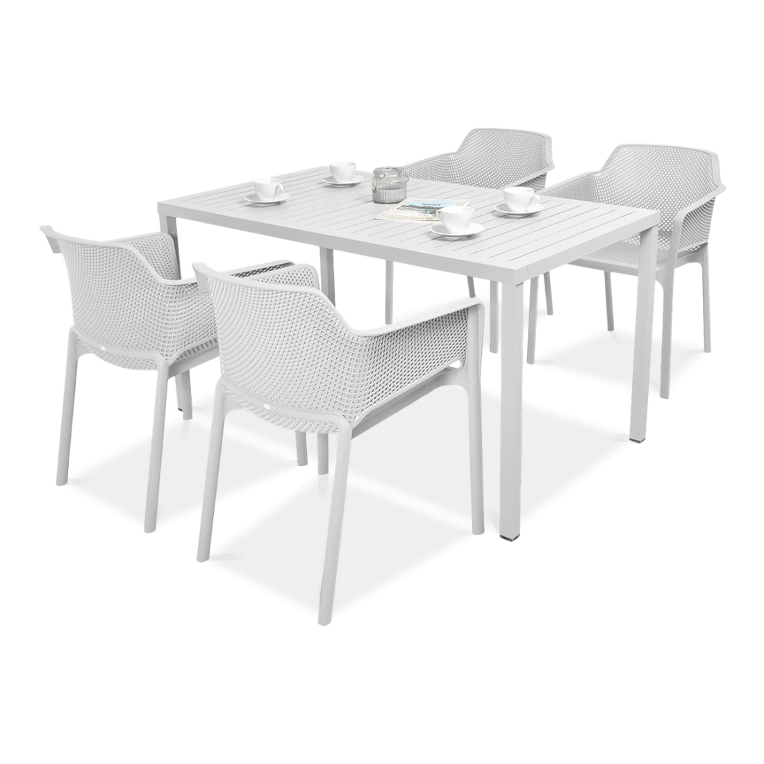 Komplet ogrodowy Nardi NET/CUBE 140 4+1 Bianco został opracowany z myślą o profesjonalnym zastosowaniu w branży HoReCa. Składa się z czterech krzeseł z żywicą polipropylenową wzmocnioną włóknem szklanym oraz stołu z kompozytu DurelTop i malowanego proszkowo aluminium. Zestaw wykonano z materiałów odpornych na warunki atmosferyczne i promieniowanie UV, co zapewnia długotrwałą eksploatację w trudnych warunkach środowiskowych.