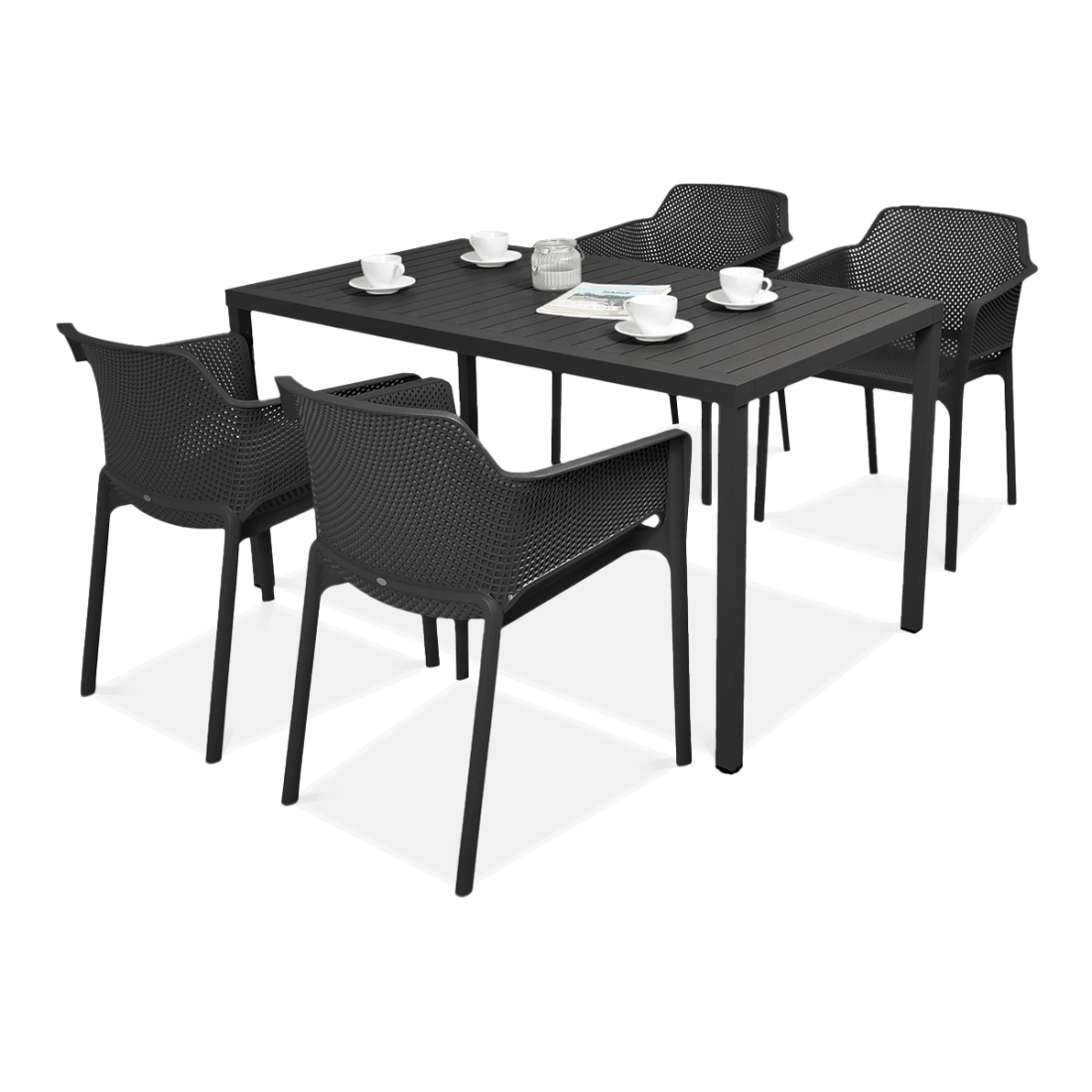 Ekskluzywny zestaw Nardi NET/CUBE 140 4+1 Antracite to idealna opcja dla firm poszukujących trwałych, eleganckich rozwiązań meblowych do ogrodu. W skład kompletu wchodzą cztery wygodne krzesła oraz funkcjonalny stół wykonany z mieszanki aluminium malowanego proszkowo oraz kompozytu DurelTop. Krzesła cechuje konstrukcja z polipropylenu wzmocnionego włóknem szklanym, co zapewnia wyjątkową wytrzymałość i odporność na czynniki zewnętrzne.