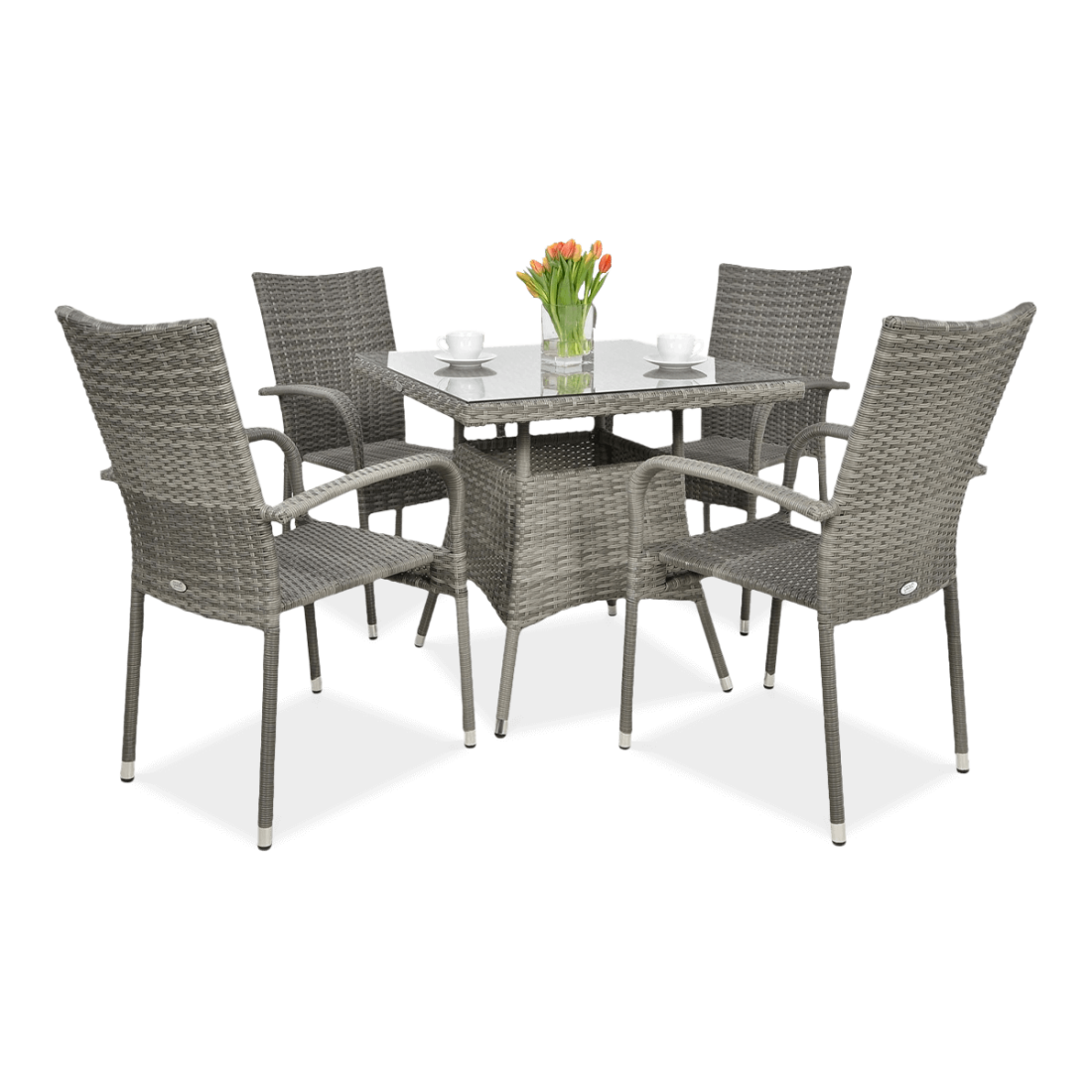 Zestaw ogrodowy składający się z czterech ergonomicznych krzeseł oraz funkcjonalnego stołu o kwadratowym blacie, wykonany z trwałych materiałów takich jak technorattan i aluminium. Konstrukcja krzeseł umożliwia sztaplowanie, co ułatwia oszczędzanie miejsca. Stół posiada powierzchnię z hartowanej szyby, zapewniającą dodatkową wytrzymałość.