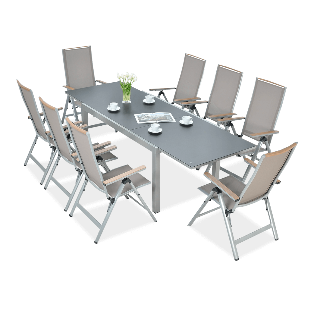 Zestaw mebli ogrodowych BRISBANE 8/250 Taupe jest idealnym rozwiązaniem dla przestrzeni zewnętrznych przeznaczonych na większe spotkania. Jego konstrukcja oparta jest na solidnym aluminium pokrytym powłoką proszkową, co gwarantuje odporność na działanie czynników atmosferycznych i korozji. Krzesła wyposażono w materiał textilene, który dostarcza komfortu podczas długotrwałego użytkowania bez dodatkowych poduszek. Stół z hartowanym szklanym blatem może być rozkładany od 150 cm do 250 cm, oferując elastyczność w organizacji miejsca. Regulowane oparcia krzeseł oraz składanie zapewniają wygodę w przechowywaniu i transportowaniu.