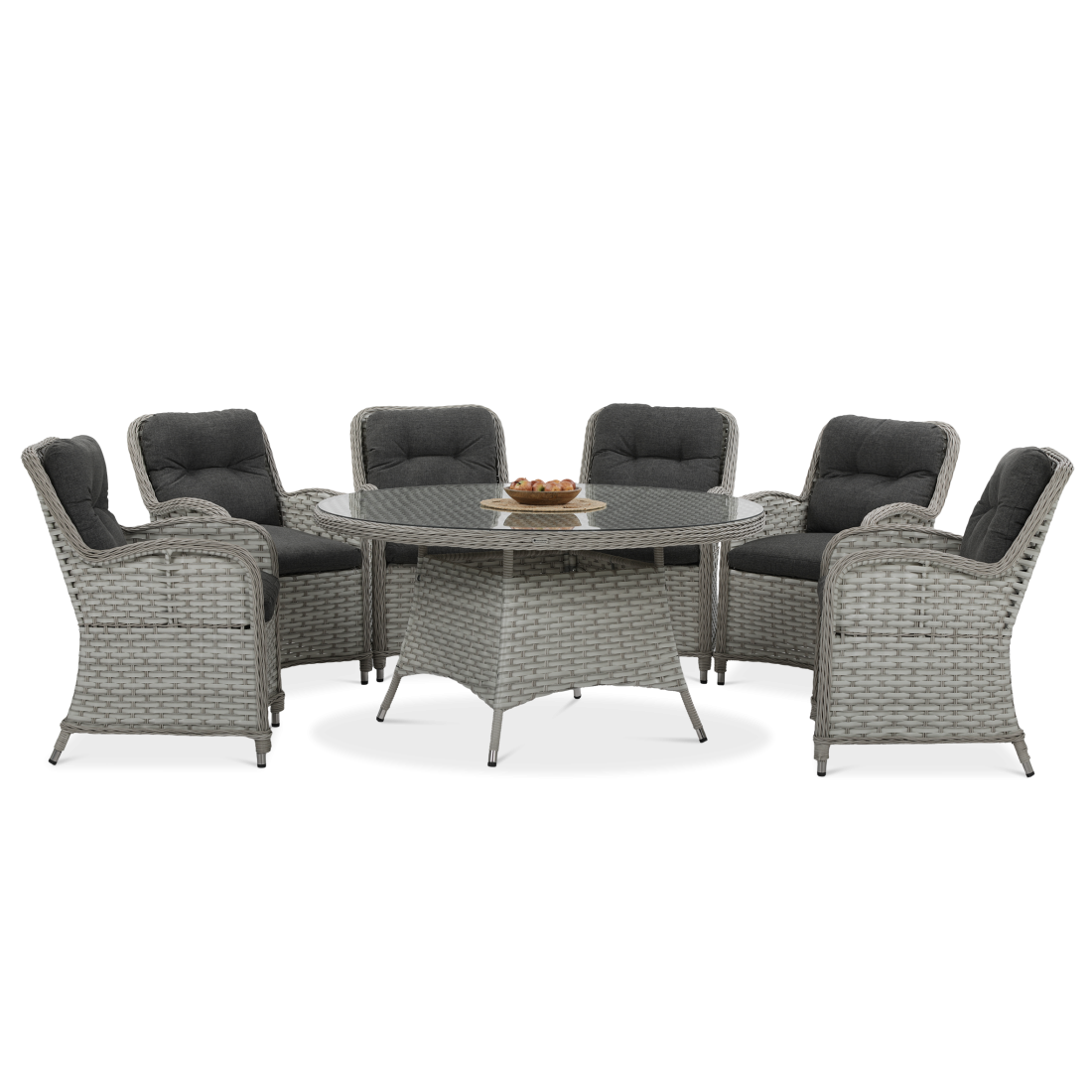 Zestaw mebli z technorattanu Barcelona Melange White charakteryzuje się solidną, aluminiową konstrukcją, odporną na korozję oraz niekorzystne warunki atmosferyczne. W skład zestawu wchodzi sześć ergonomicznych foteli oraz okrągły stół o średnicy 140 cm, wyposażony w blat ze szkła hartowanego, co gwarantuje bezpieczeństwo i trwałość. Dodatkowo, plecionka technorattanowa zapewnia długowieczność, nie ulegając odkształceniom, a łatwe w pielęgnacji poduszki z zamkami błyskawicznymi czynią użytkowanie bardziej komfortowym.