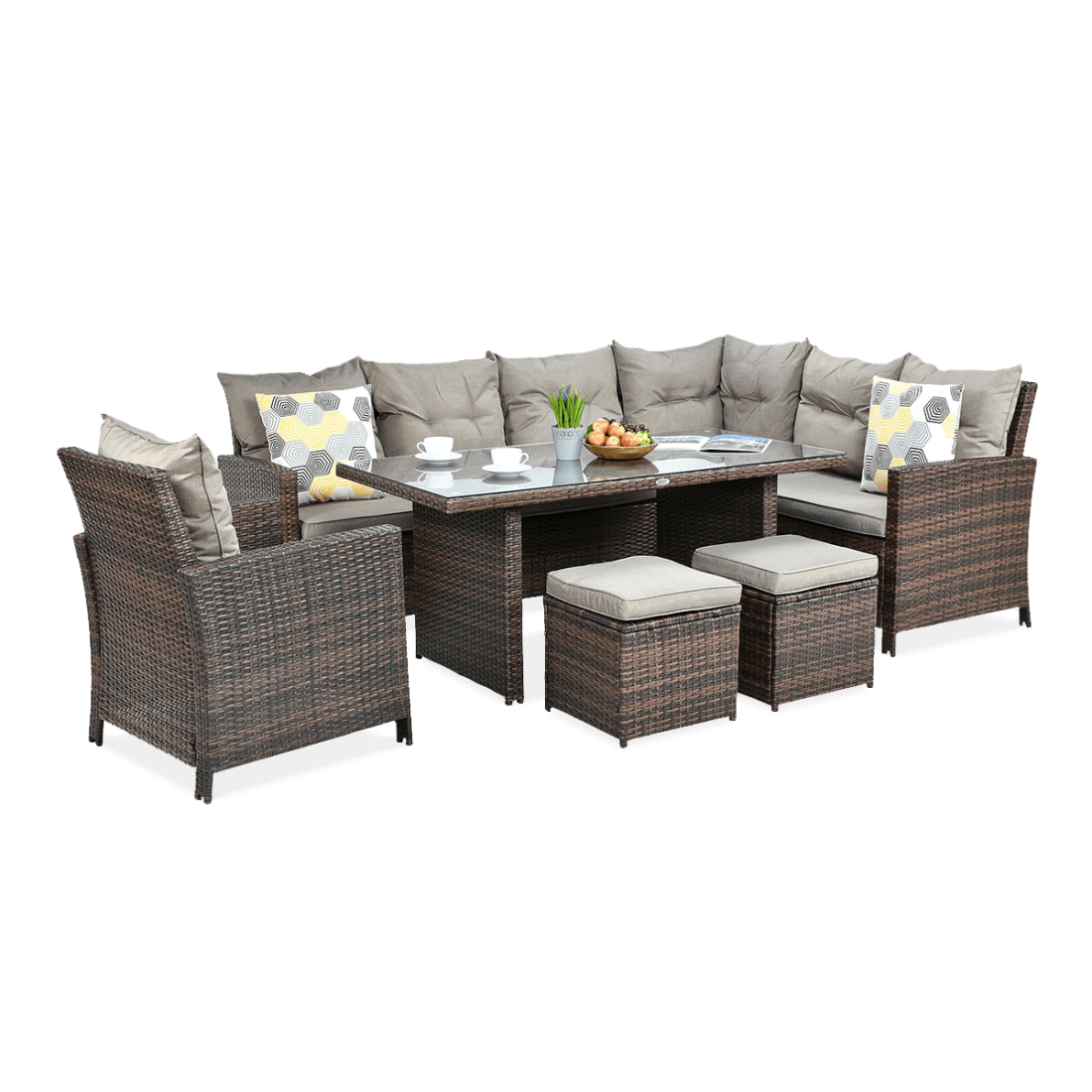 Narożnik IBIZA z technorattanu to funkcjonalny zestaw mebli ogrodowych stworzony z myślą o płynnej adaptacji w różnorodnym środowisku biznesowym. Został skonstruowany na solidnym stalowym stelażu, zapewniając niezawodność i odporność na warunki atmosferyczne. Zestaw obejmuje narożnik z dwoma głównymi modułami, fotel, dwa pufy oraz duży stół jadalniany z hartowanym szkłem, co pozwala na elastyczne użycie zarówno dla celów wypoczynkowych jak i cateringowych.