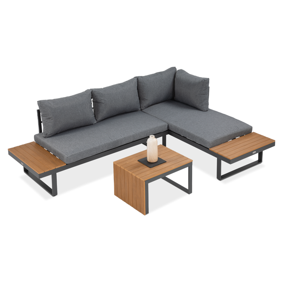 Aluminiowa rama narożnika modułowego TULIP Dark Grey, charakteryzująca się lekką, a zarazem solidną konstrukcją, zapewnia wytrzymałość i trwałość w każdych warunkach zewnętrznych. Malowanie proszkowe w odcieniu ciemnoszarym nadaje mu nowoczesny wygląd oraz odporność na korozję. Produkt zawiera moduły, które można dowolnie konfigurować, co pozwala na elastyczne dostosowanie do różnorodnych przestrzeni. Centralny stolik z blatem imitującym drewno wzmacnia atrakcyjność wizualną i funkcjonalność zestawu.