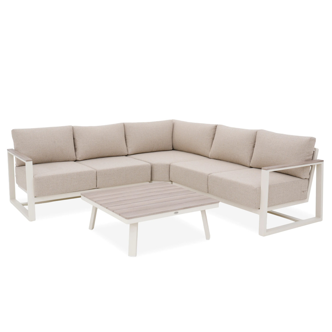 Narożnik ogrodowy STELVIO CAFFE Beige to nowoczesne rozwiązanie dla przestrzeni zewnętrznych. Zestaw łączy wytrzymałą, aluminiową ramę z efektowną plecionką z liny syntetycznej. Komfort użytkowania zapewniają poduszki siedziska o grubości 20 cm, pokryte trwałą tkaniną barwioną w masie, co ułatwia utrzymanie w czystości. Wkomponowane detale z polywood na podłokietnikach i blacie stolika podkreślają nowoczesny styl.