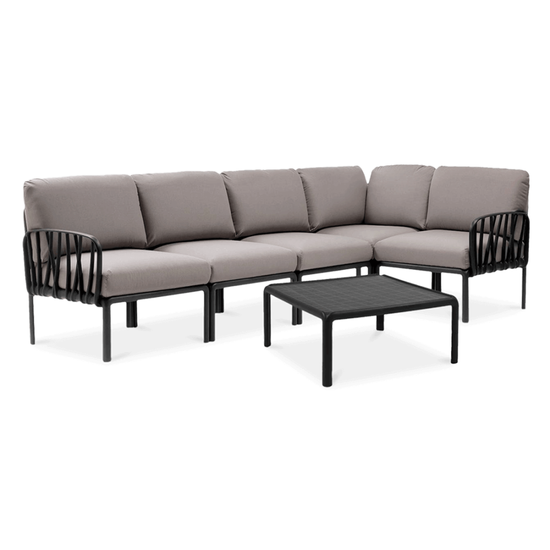 Modułowy narożnik ogrodowy marki Nardi, model KOMODO, oferuje wszechstronność konfiguracji dzięki pięciu podstawowym elementom, które umożliwiają dowolne aranżacje wnętrz i przestrzeni zewnętrznych. Zaawansowane technologicznie tworzywo, jakim jest polipropylen wzmocniony włóknem szklanym, gwarantuje niezmienną estetykę i trwałość niezależnie od warunków atmosferycznych. Zintegrowane poduszki z wodoodpornej tkaniny łączą komfort z praktycznością użytkowania.
