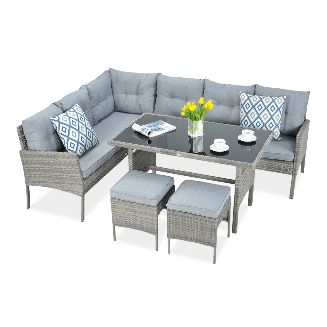 Zestaw mebli ogrodowych CORTINA, składający się z dwóch sof narożnych, dwóch puf oraz stołu obiadowego, został stworzony z myślą o funkcjonalności i trwałości. Konstrukcja wsparta jest na stalowym stelażu, co zapewnia stabilność, a wykorzystanie grubego szczotkowanego technorattanu gwarantuje odporność na warunki atmosferyczne i mechaniczne. Stół wyposażony jest w hartowany szklany blat, dopełniając całości eleganckim wyglądem.