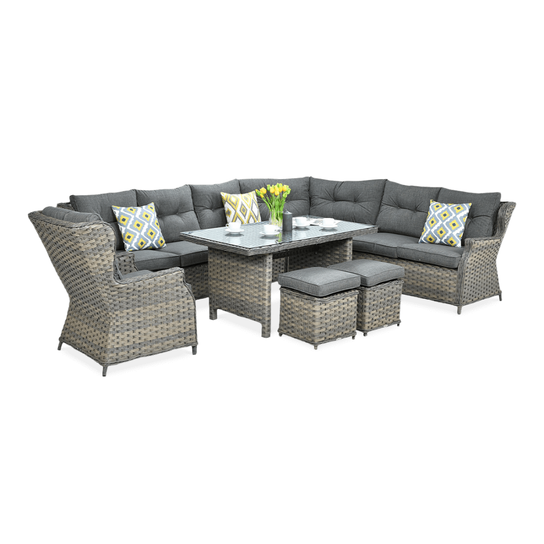 Narożnik z Technorattanu Trivento Dining Melange to doskonałe połączenie elegancji i funkcjonalności. Wykonany z wysokiej jakości technorattanu, cechuje się wytrzymałością na warunki atmosferyczne, co sprawia, że nadaje się idealnie do użytku zewnętrznego. Konstrukcja narożnika została starannie zaprojektowana, aby zapewnić komfort użytkowania oraz elegancki wygląd.