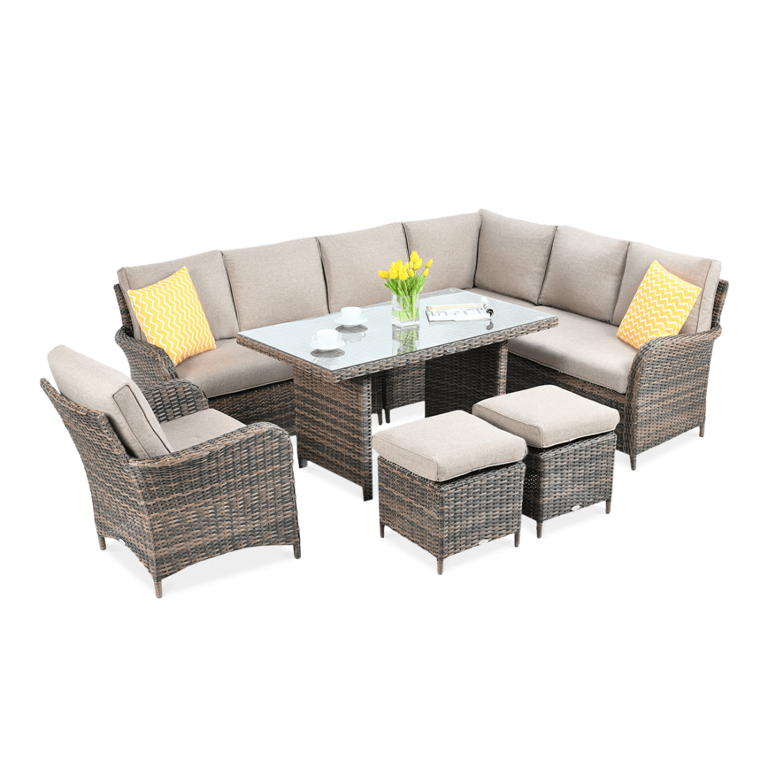 Naroznik technorattanowy Ventura Grand Brown to modulowy zestaw mebli ogrodowych wykonany z wysokogatunkowego technorattanu w odcieniu brazowym. Korpus oparty na aluminiowej ramie zapewnia odpornosc na warunki atmosferyczne i latwosc konserwacji. Poszycie siedzisk wykonane z trwalej tkaniny poliestrowej cechuje sie odpornoscia na wilgoc. W sklad zestawu wchodza segmenty narozne, srodkowe, podlokietniki oraz funkcjonalny stolik kawowy z blatem szklanym. Przemyslane proporcje modulow oraz ergonomiczne poduszki umozliwiaja wygodne uzytkowanie w przestrzeniach komercyjnych i prywatnych.