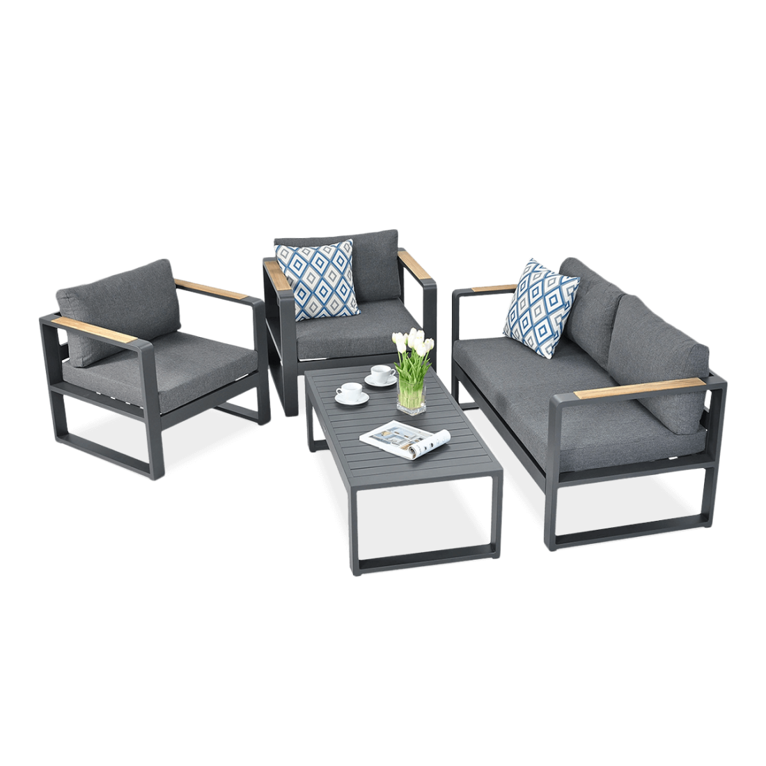 Zestaw wypoczynkowy Panama w kolorze antracytowym to komplet mebli ogrodowych przeznaczony do profesjonalnych zastosowań zewnętrznych. W skład kompletu wchodzą dwa fotele, sofa dwuosobowa oraz praktyczny stolik. Meble wykonane są z wytrzymałego tworzywa o fakturze przypominającej rattan, które cechuje odporność na działanie warunków atmosferycznych, w tym wilgoć, promieniowanie UV oraz zmiany temperatury. Konstrukcja oparta na solidnych ramach gwarantuje stabilność i łatwość użytkowania w intensywnie eksploatowanych przestrzeniach. Zestaw wyposażony jest w miękkie poduszki, które podnoszą komfort użytkowania.