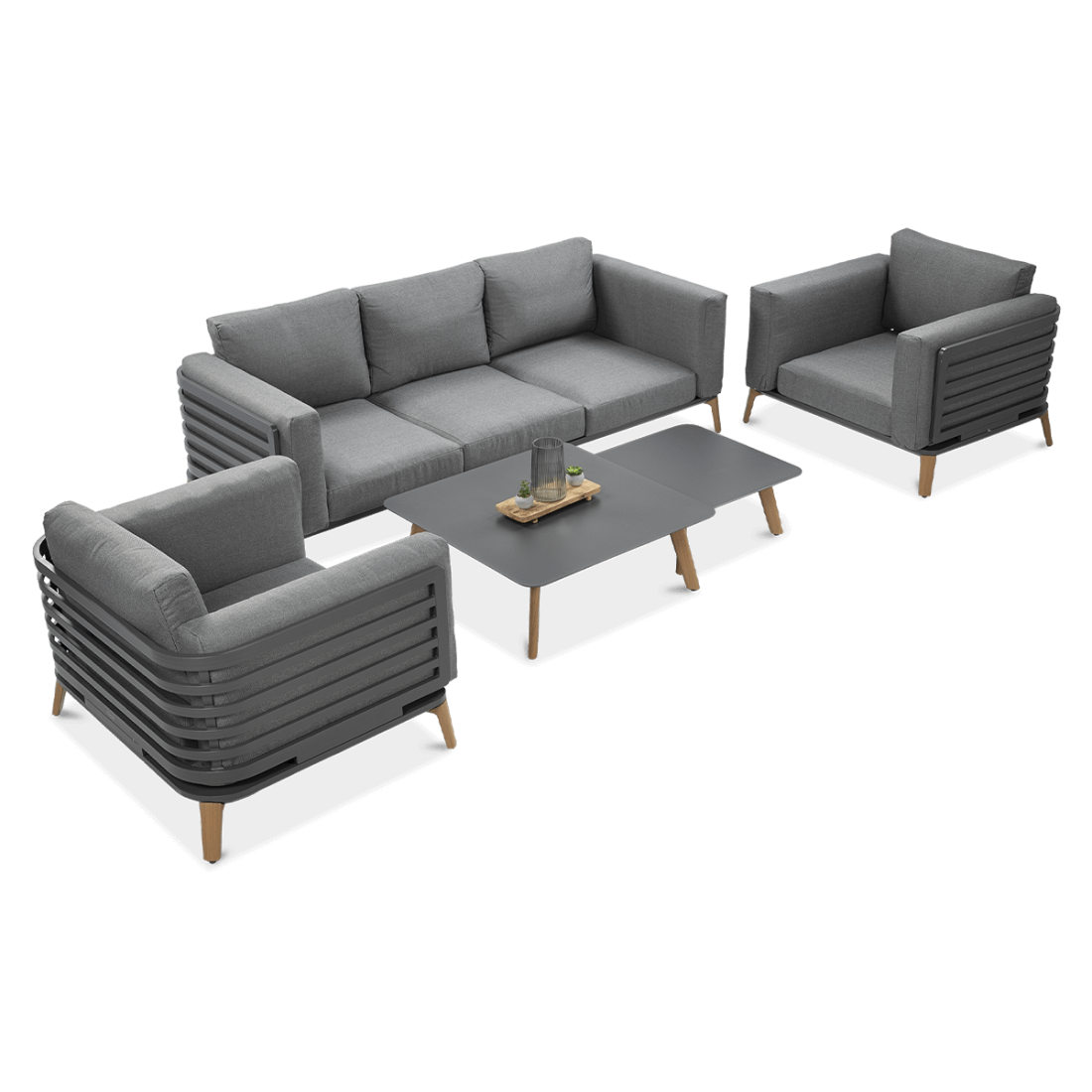 Zestaw mebli Radisson Caffe to solidne i funkcjonalne rozwiązanie dla przestrzeni zewnętrznych. Komplet składa się z pięciu elementów: trzyosobowej sofy, dwóch foteli oraz dwóch stolików kawowych o różnej wielkości, co pozwala na optymalne wykorzystanie przestrzeni. Konstrukcja wykonana z aluminium zapewnia wytrzymałość i lekkość, co ułatwia przemieszczanie mebli. Głębokie siedziska oraz grube poduszki gwarantują komfort użytkowania, a zdejmowane pokrowce ułatwiają utrzymanie czystości.