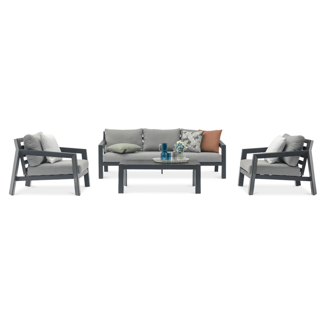 Zestaw wypoczynkowy Henderson Caffe Anthracite to perfekcyjne rozwiązanie dla profesjonalnych przestrzeni ogrodowych. Jego składowe to sofa trzyosobowa, dwa fotele oraz stolik kawowy, wszystkie elementy wykonane z najwyższej jakości materiałów. Blat stolika z kamienia spiekanego zapewnia trwałość, natomiast ramy aluminiowe pokryte są proszkowo, co zwiększa ich odporność na warunki zewnętrzne.