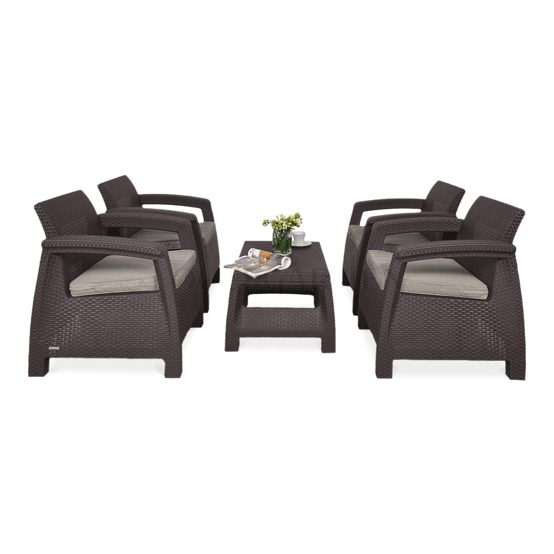 Komplet ogrodowy składa się z czterech ergonomicznych foteli oraz funkcjonalnego stolika kawowego. Wykonany z wysokiej jakości polipropylenu o strukturze imitującej naturalny rattan, zestaw oferuje nie tylko elegancki wygląd, ale i trwałość. Odporny na promieniowanie UV oraz różnorodne warunki atmosferyczne, komplet zapewnia komfort dzięki odpowiednio profilowanym oparciom oraz wytrzymałym poduszkom z zamkiem błyskawicznym. Przeznaczony do długotrwałego użytku zewnętrznego, komplet jest prosty do samodzielnego montażu.