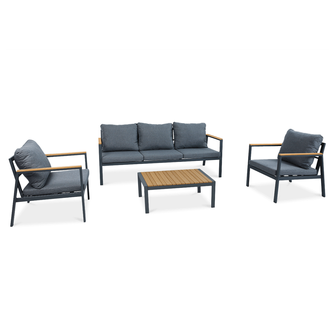 Zestaw mebli ogrodowych EDISON CAFFE Dark Grey od Focus Garden zbudowany jest z ocynkowanej stali malowanej proszkowo, co zapewnia trwałość i odporność na korozję. Zawiera dwa fotele, trzyosobową sofę oraz stolik, a całość dopełniają poduszki wykonane z tkaniny olefinowej, odpornej na wilgoć i promieniowanie UV. Elementy takie jak blat stolika i podłokietniki zostały wykonane z polywoodu, który łączy estetykę drewna z materiałami sztucznymi.